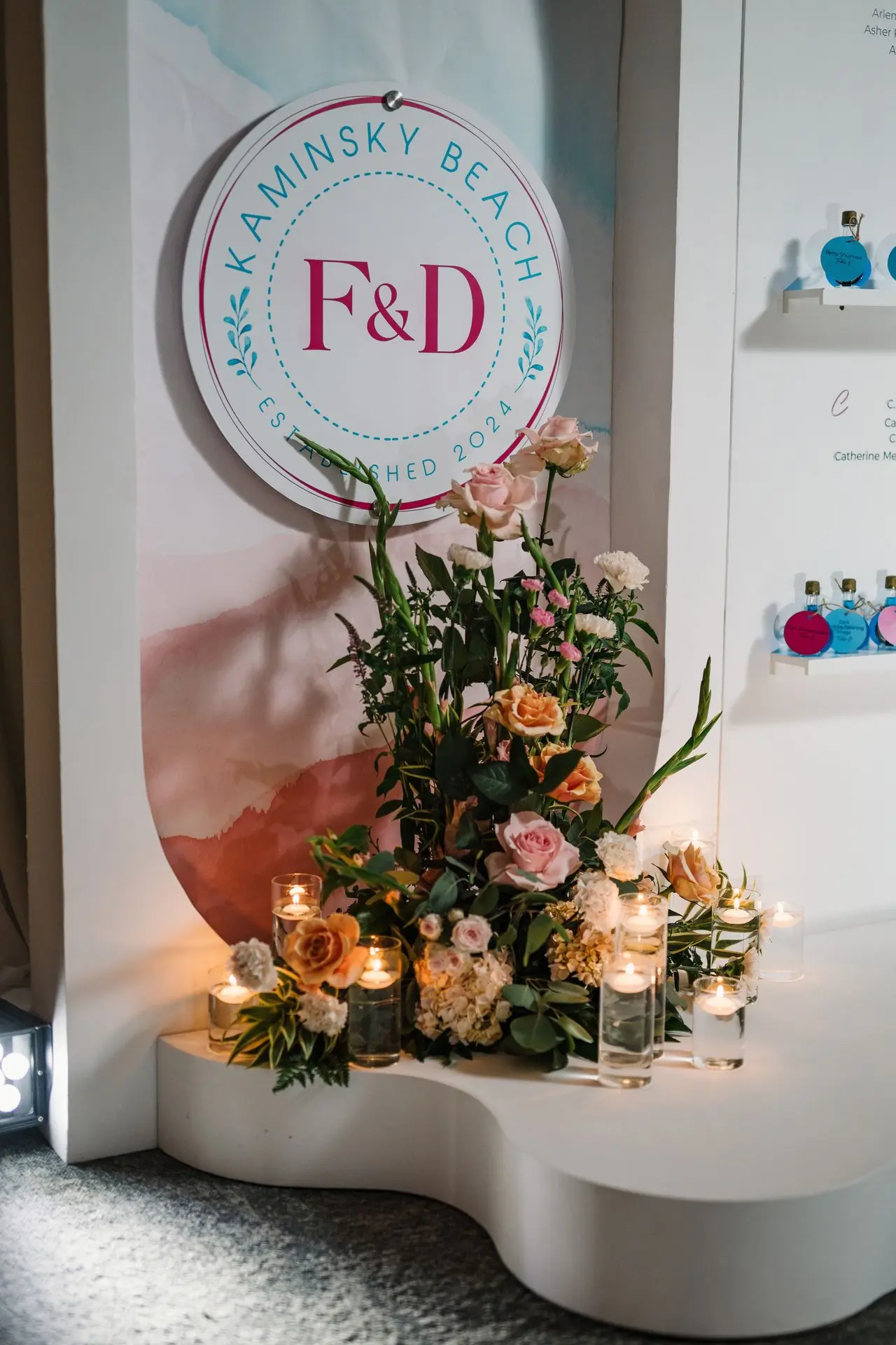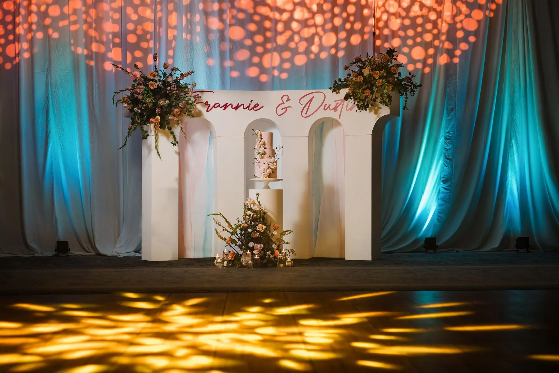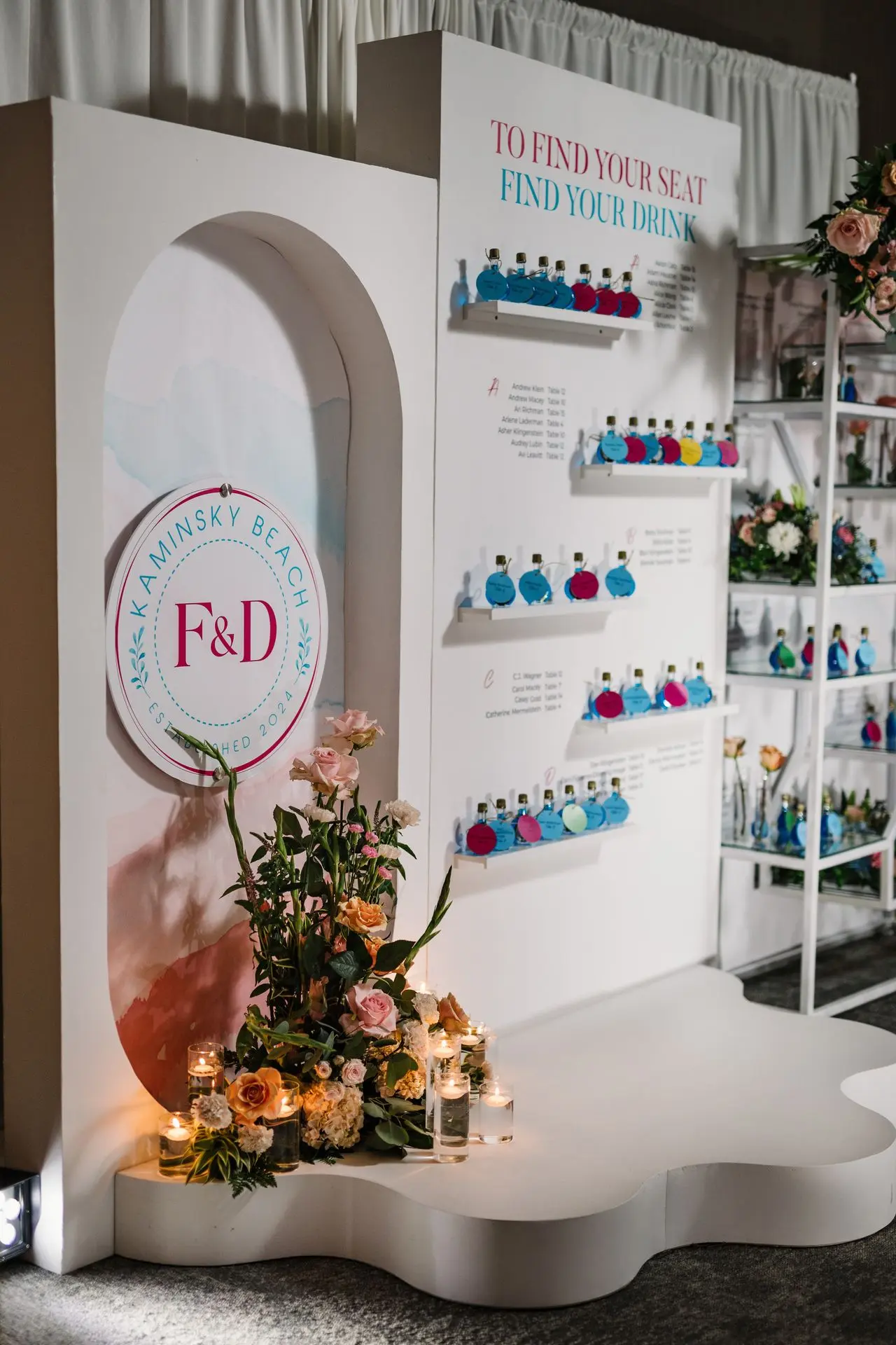 For the reception, guests were greeted by a custom-built escort wall featuring mini Blue Curaçao bottles—doubling as seating assignments and keepsakes. Inside, the design details were everywhere: a lush floral ceiling installation above the dance floor, white draping that moved like waves, floating candles, custom napkin holders stamped with their wedding logo, and a statement cake wall with a towering three-tier cake. Even the DJ booth glowed with their logo, waiting for the moment Frannie & Dustin jumped in to hype up the crowd.