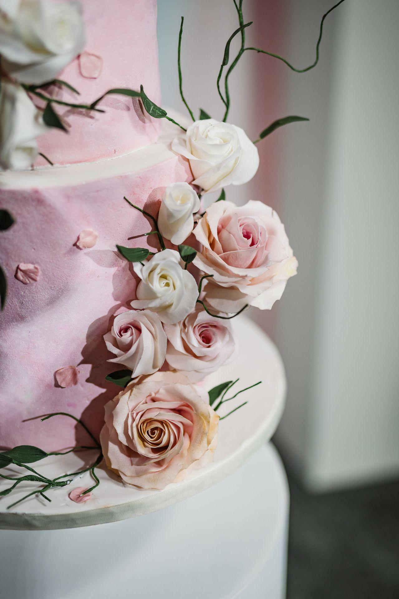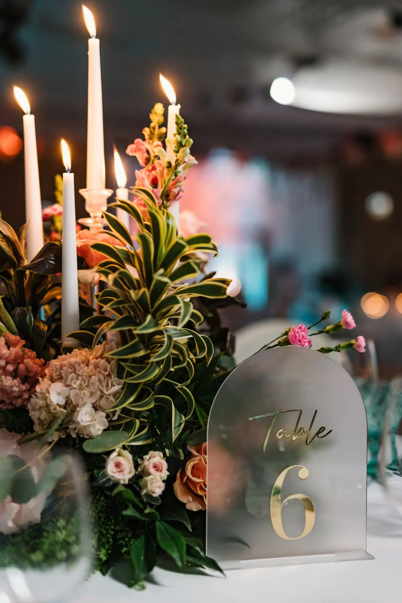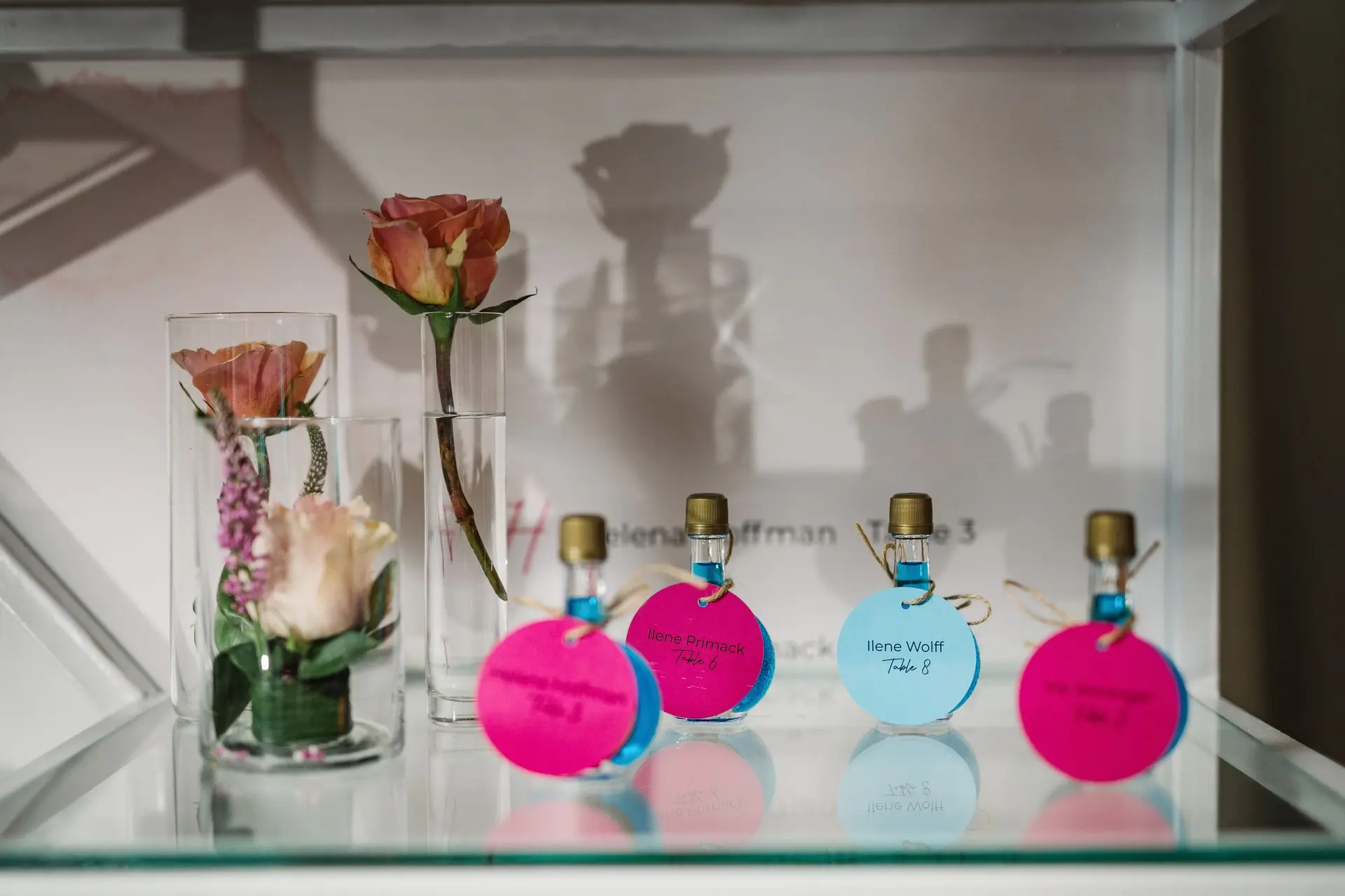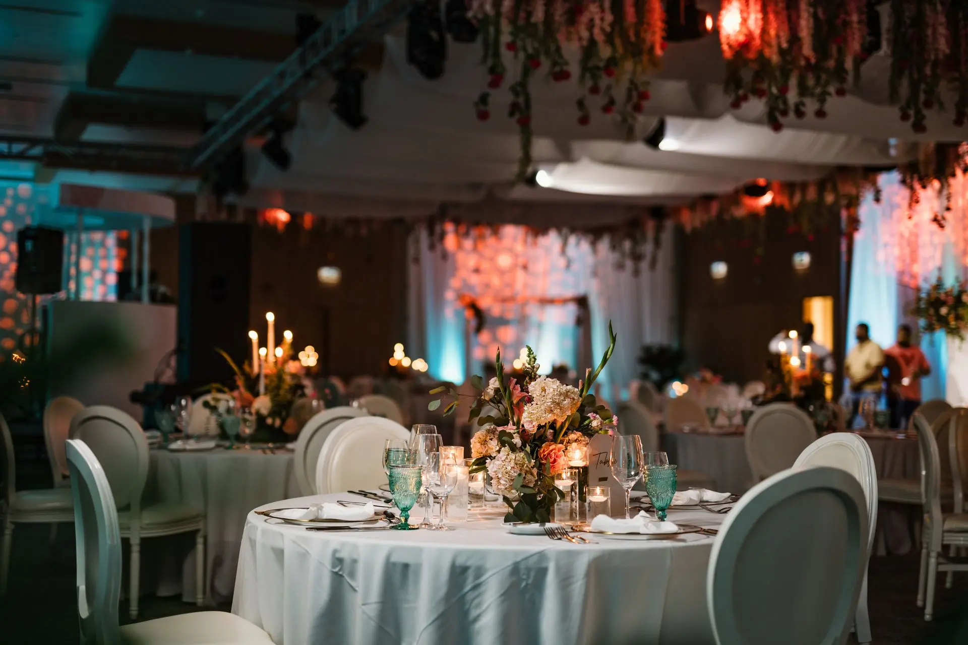 For the reception, guests were greeted by a custom-built escort wall featuring mini Blue Curaçao bottles—doubling as seating assignments and keepsakes. Inside, the design details were everywhere: a lush floral ceiling installation above the dance floor, white draping that moved like waves, floating candles, custom napkin holders stamped with their wedding logo, and a statement cake wall with a towering three-tier cake. Even the DJ booth glowed with their logo, waiting for the moment Frannie & Dustin jumped in to hype up the crowd.