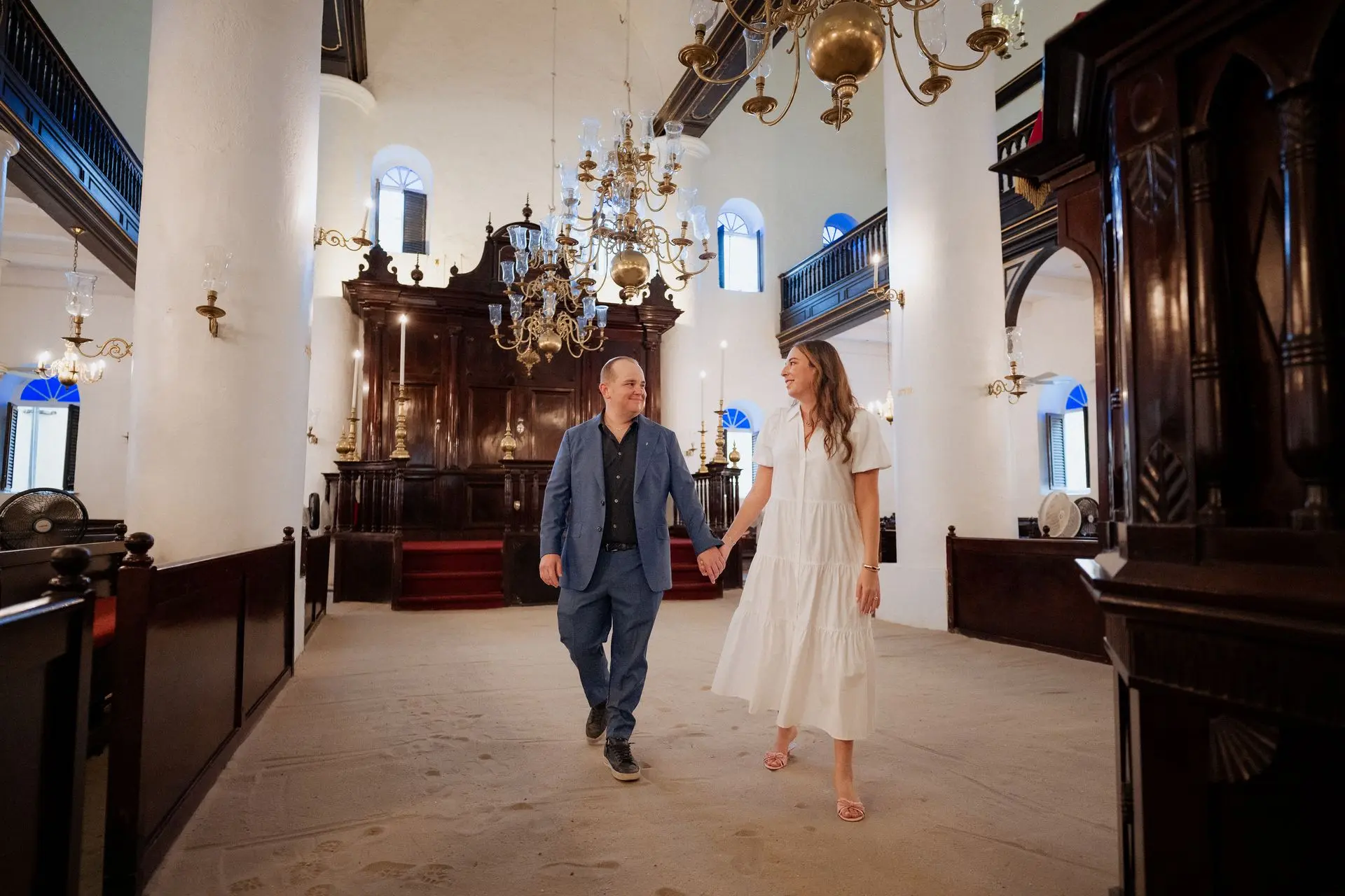 Day two was all about meaning and tradition. Frannie & Dustin held their Ketubah signing and Shabbat service at the stunning Mikvé Israel-Emanuel Synagogue, affectionately known as “Snoa.” With its warm glow and centuries-old history, it was the perfect setting to honor this sacred moment. That evening, everyone gathered at the Marriott for an intimate Shabbat dinner, with soft lighting and pink-and-blue florals that made the space feel like a warm hug.