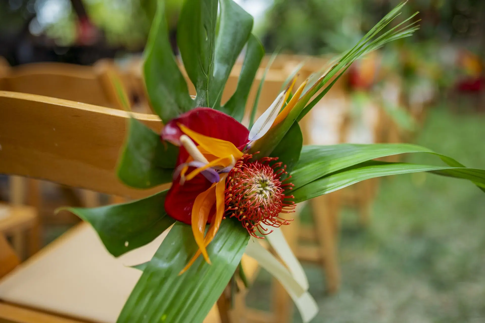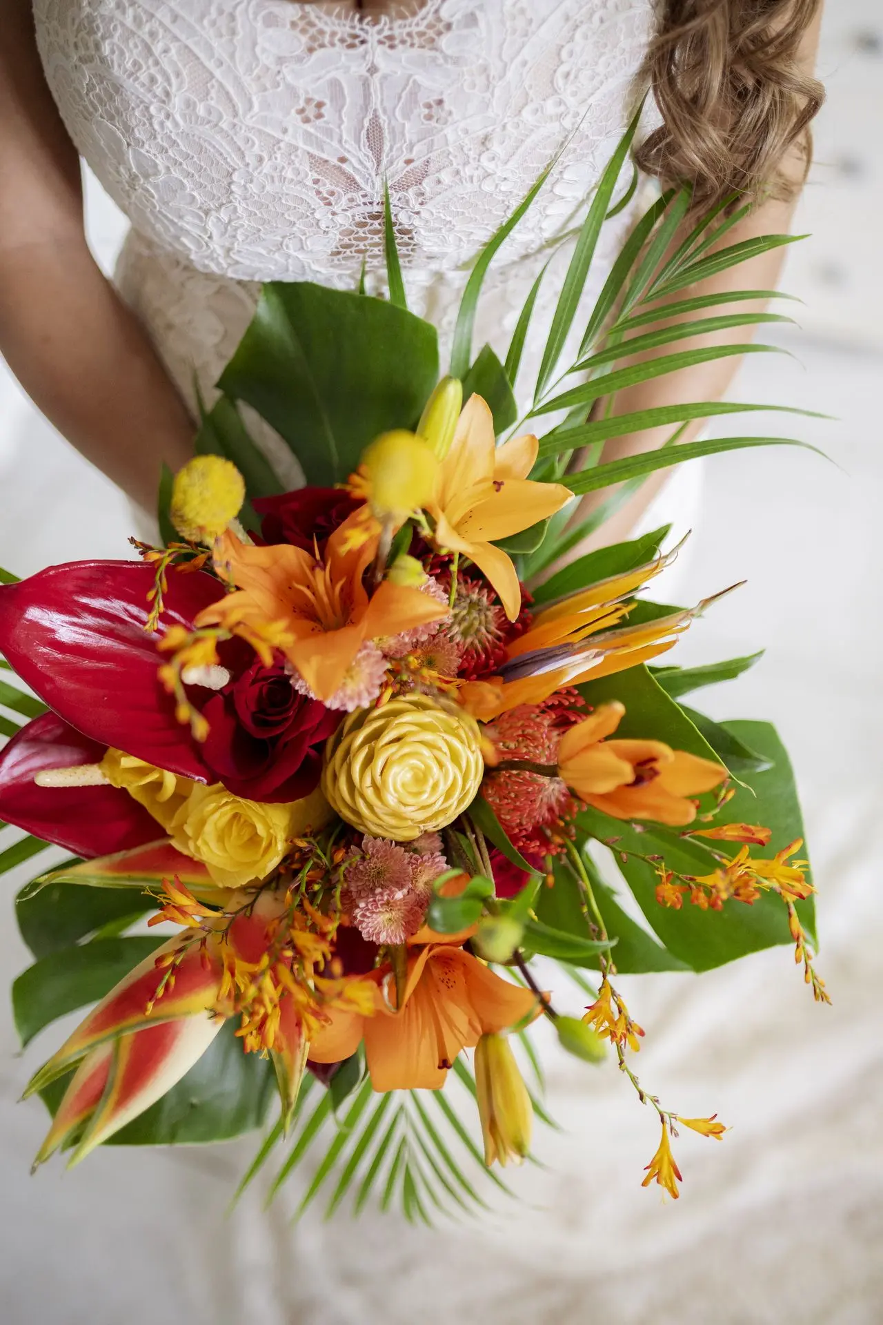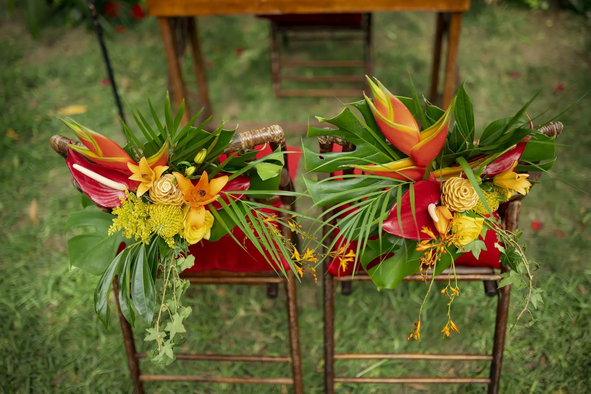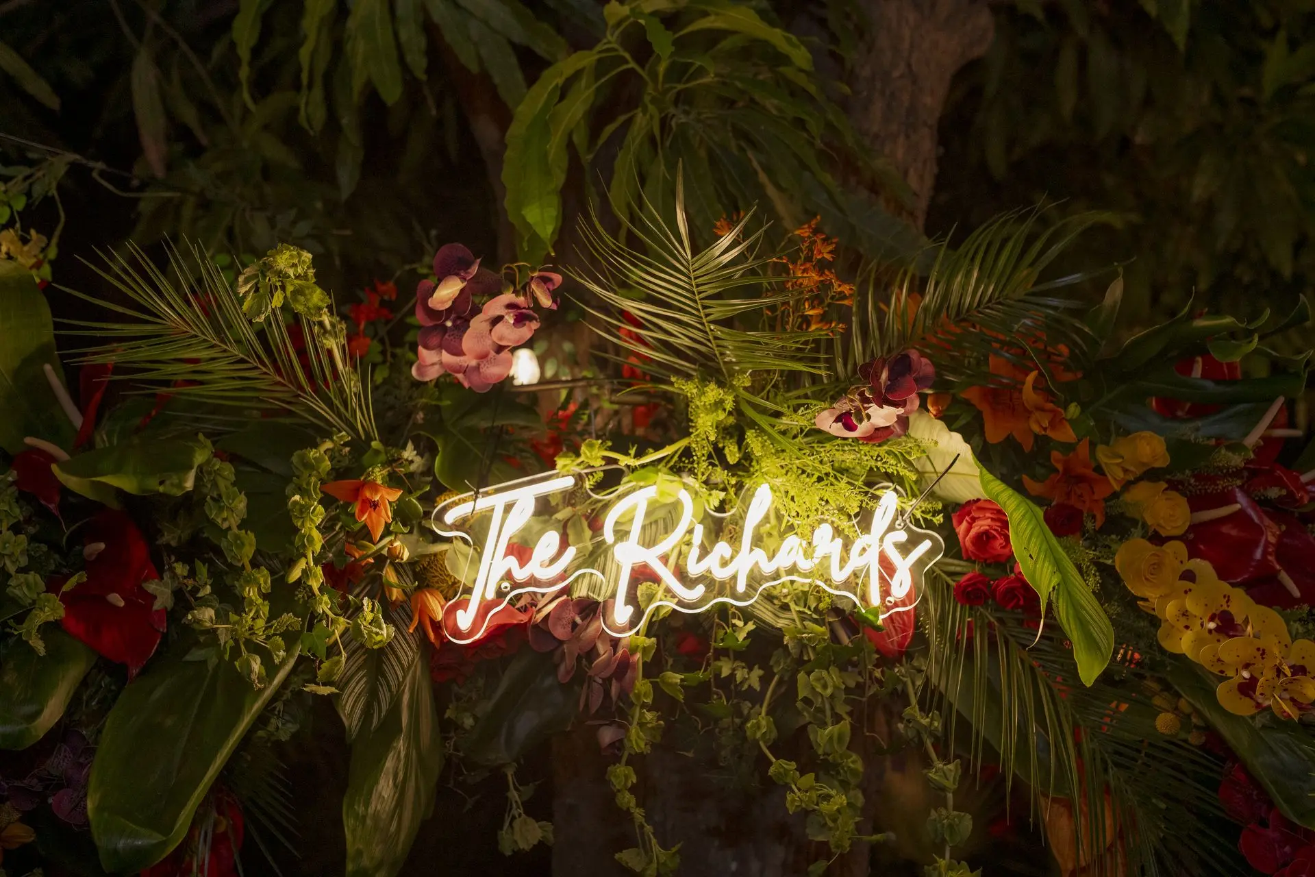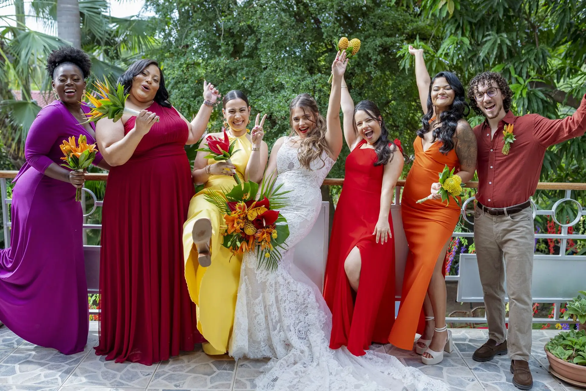 The ceremony backdrop was one of my favorite elements—a half-moon arch overflowing with vibrant, colorful flowers. It set the stage beautifully and tied in perfectly with my favorite detail of all: the colors. Each member of my bridal party was assigned a unique shade, each carrying a different flower that represented them—different, beautiful, and completely their own—which all came together in my bouquet.