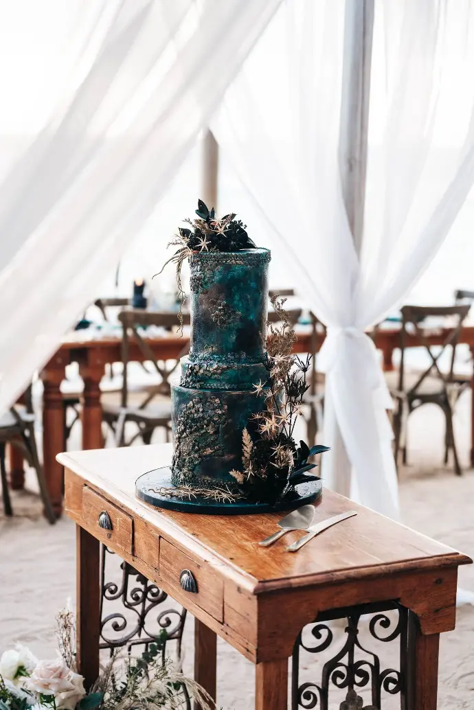 Orchestrating a wedding with so many moving parts is no easy feat, but the result was pure magic. Their chosen color palette of black, white, and emerald green set the stage for a striking aesthetic. Lush white and cream florals intertwined with pampas grass created an elegant contrast, while flickering candles of varying heights added a romantic glow to the long table setting.
