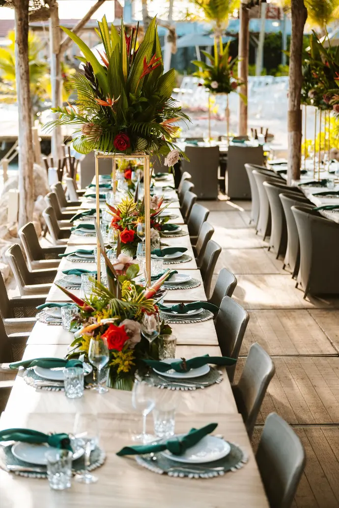 From that point on, everything fell into place like magic. The vibrant hues of their tropical theme came to life against the backdrop of Mood's grand gazebo set against the shimmering Caribbean Blue waters, while the mix of tall and short table settings added a playful touch to the evening. I couldn't be more thrilled with how everything came together – those bold colors really made a statement!